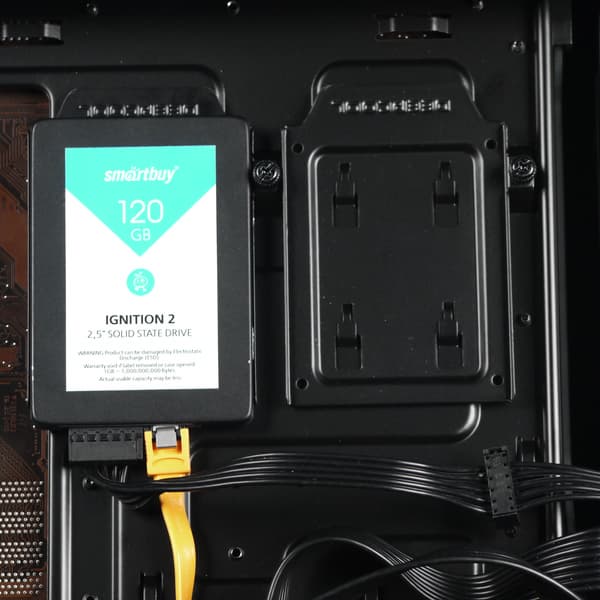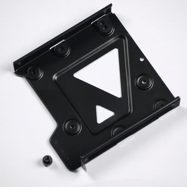 Для накопителя формата 2,5″ предусмотрены два посадочных места на обратной стороне основания для системной платы около передней стенки шасси. Фиксация накопителя осуществляется при помощи винтов, которые нужно закрутить в накопитель со стороны дна сквозь основание для системной платы (с лицевой стороны).