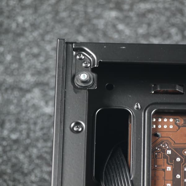 Стоит отметить, что откручивать эти винты можно и изнутри, но для этого потребуется отвертка — как минимум, в первый раз. И этот процесс тут не очень удобен, потому что над панелью с винтами нависает угловой элемент шасси, в итоге вставить отвертку вертикально не представляется возможным, а если вставлять отвертку под достаточно большим углом, это затрудняет процесс сборки. Винт, конечно, рано или поздно открутится, но усилий для этого будет затрачено больше, чем обычно. И все же, такая возможность имеется.