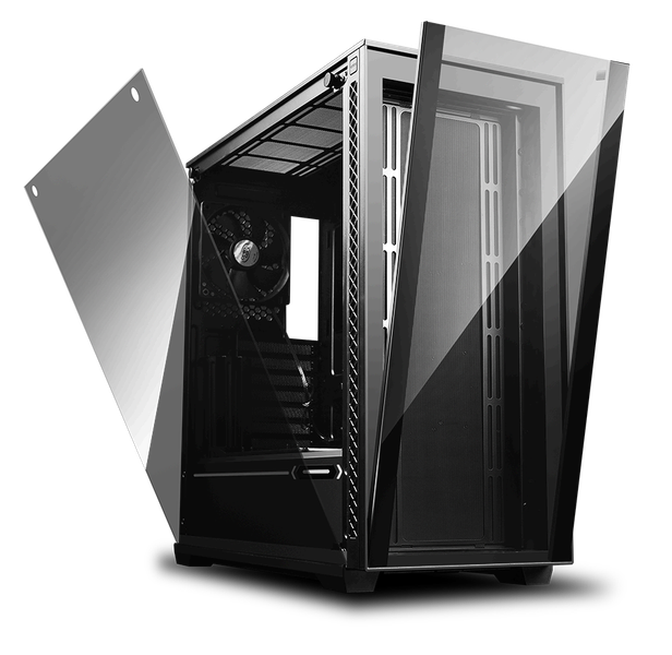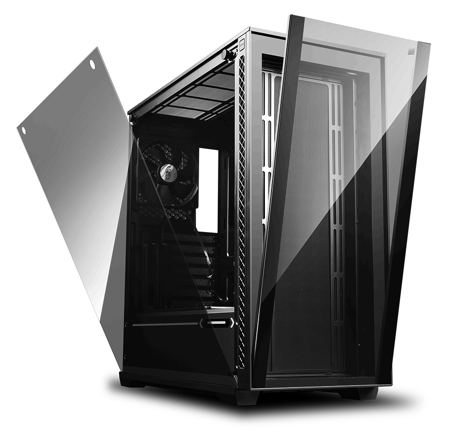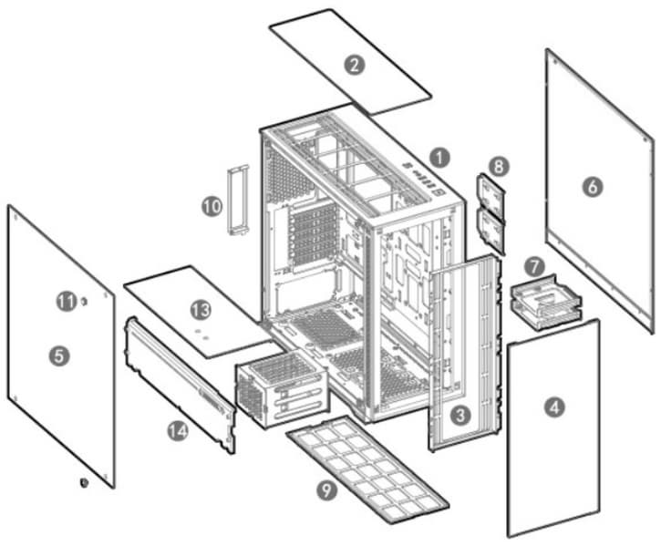 Корпус представляет собой решение башенного типа с вертикально размещаемой платой формата E-ATX (шириной до 330 мм) или ATX (и менее габаритной) и горизонтальным расположением блока питания снизу.