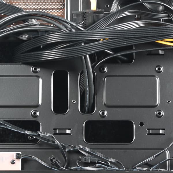 Глубина отсека для прокладки проводов составляет около 30 мм у задней стенки. Для монтажа проводов предусмотрены петли для крепления стяжек или других аналогичных изделий. Лепестковые мембраны в монтажных отверстиях отсутствуют.