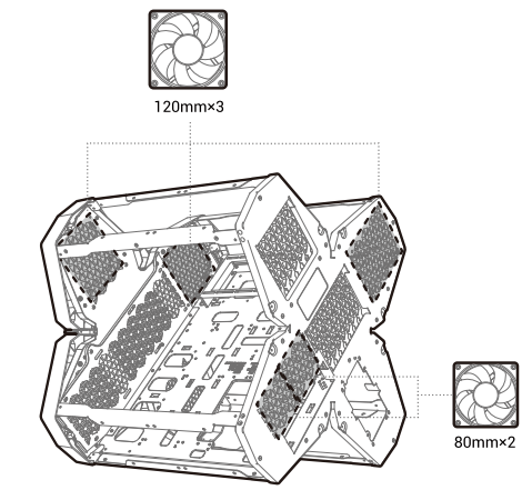 Отдельно предусмотрены места для вентиляторов, они расположены на шасси под внешними стенками на ребрах. Тут можно установить по 2 вентилятора типоразмера 120 мм.