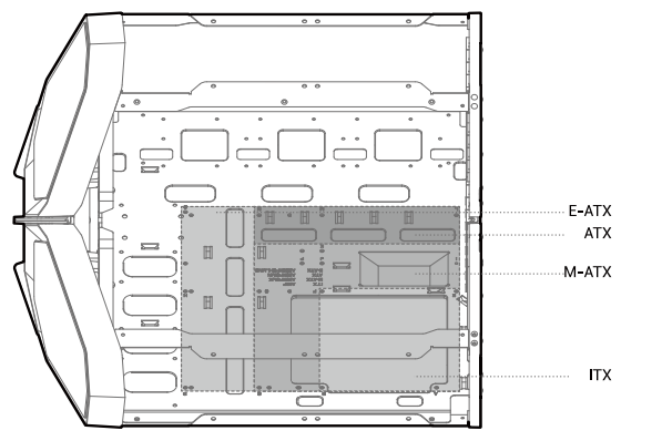 Корпус представляет собой решение для системных плат формата ATX (и менее габаритных). Также заявлена поддержка плат E-ATX, причем плату можно установить полноразмерную, шириной до 330 мм (SSI EEB), или укороченную, шириной до 267 мм (SSI CEB).