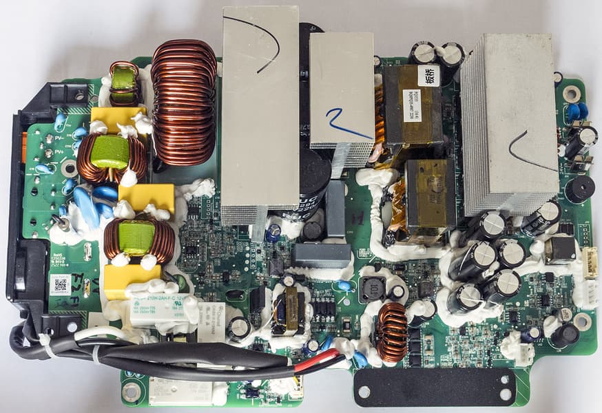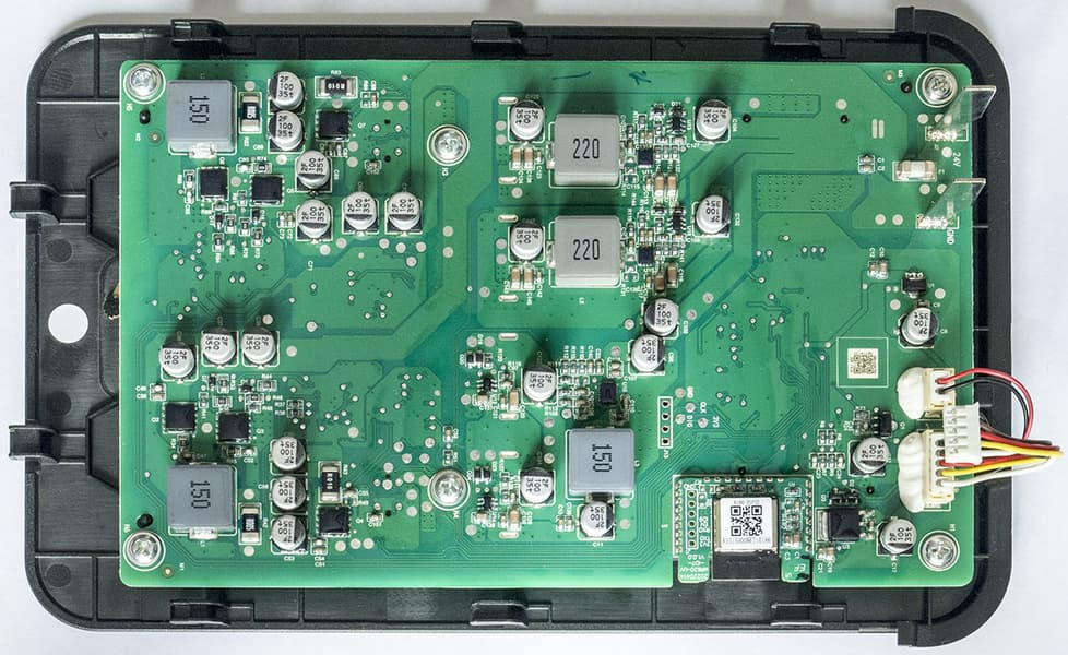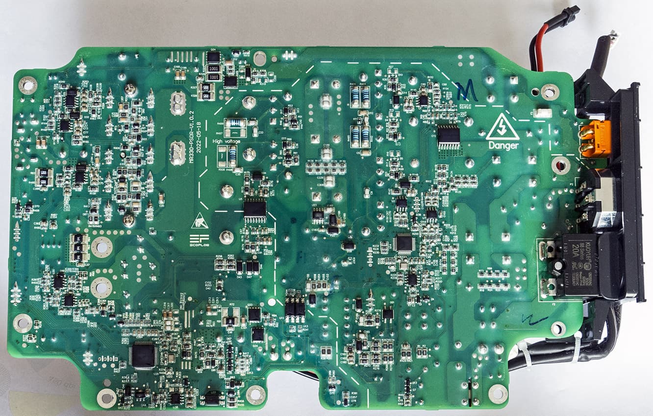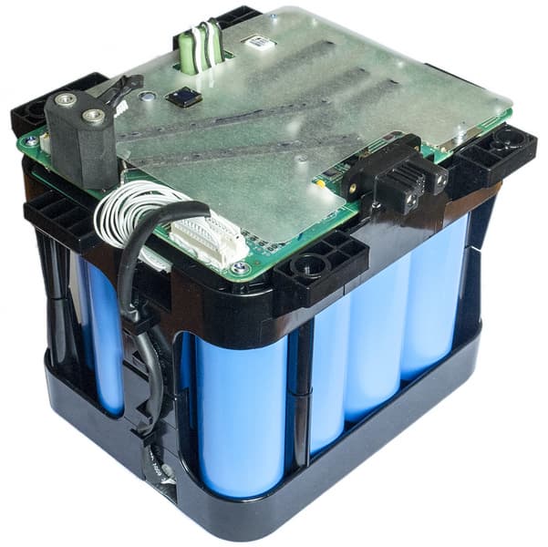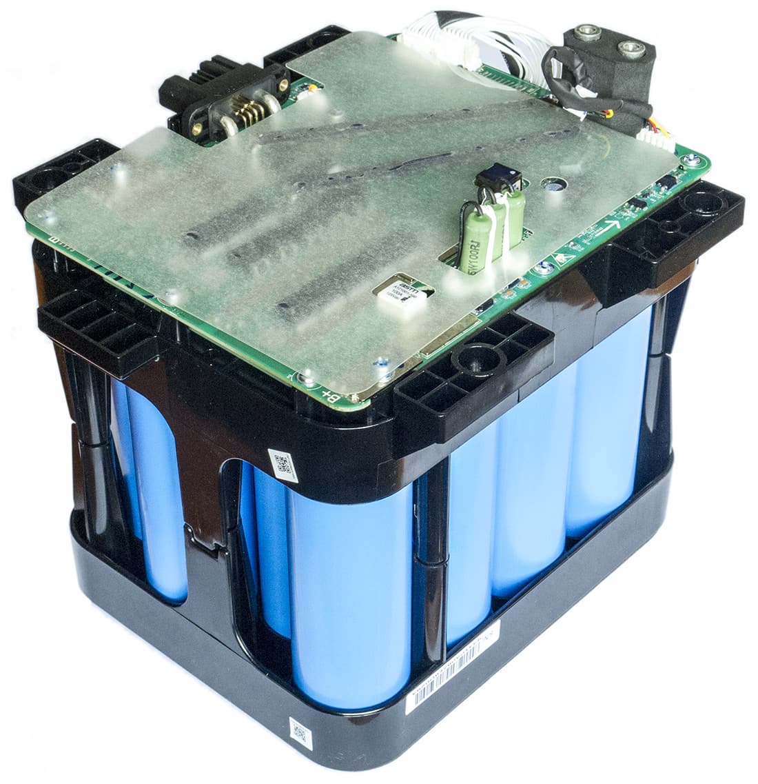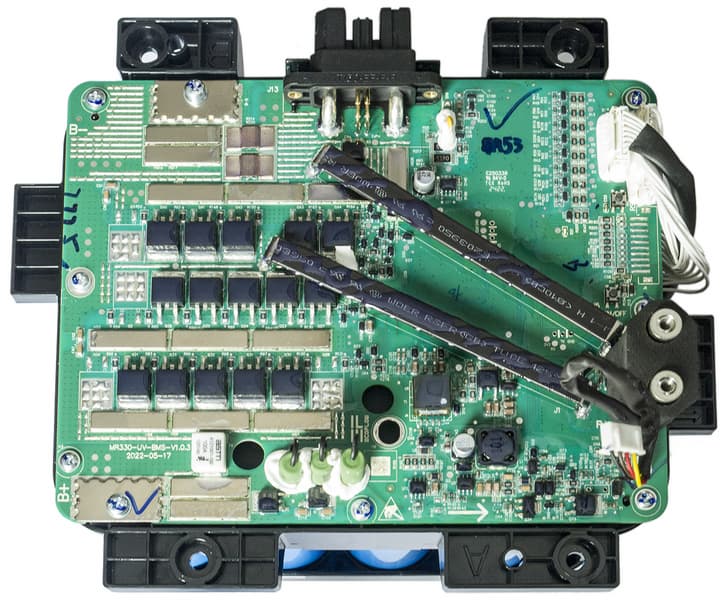 Сверху находится плата с балансировочными схемами, позволяющими нивелировать индивидуальные особенности последовательно включенных аккумуляторов, входящих в батарею, и тем самым продлить срок ее службы.