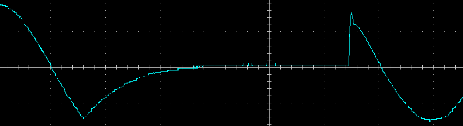 Переходный процесс занял около 25 мс, что хоть и укладывается в обозначенные инструкцией рамки, но «по жизни» все же многовато: если подключена лампа накаливания, то в момент переключения она явственно мигает; конечно, это вполне можно пережить, а вот как скажется столь длительный переход на более сложной аппаратуре — в общем случае предсказать невозможно, надо пробовать.