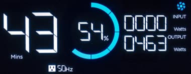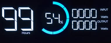 При уровне заряда 87% потребление снизилось до 610 Вт, а вентиляторы существенно уменьшили обороты. Следующий этап снижения мощности произошел при заряде в 96% — до 320 Вт (интересно, что оценка времени до окончания подскочила с 15 до 19 минут), но шум остался на прежнем уровне. После достижения заряда в 100% отображалось близкое к нулевому потребление от сети, а для времени появились цифры 99 (часов) — так оценивает контроллер автономность при полном заряде и нулевой нагрузке; вентиляторы отключились почти сразу после окончания заряда.