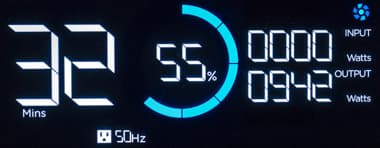 - чуть помельче в две строчки — энергопотребление по входу и на выходе в ваттах, по четыре цифры, при перегрузке ниже появляется надпись Overload.