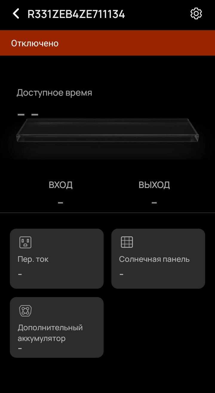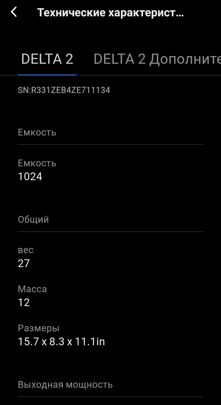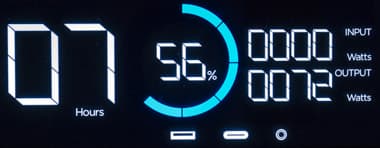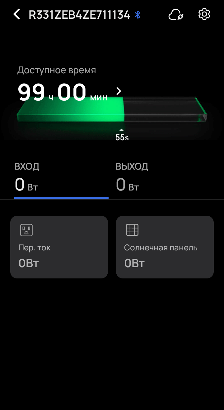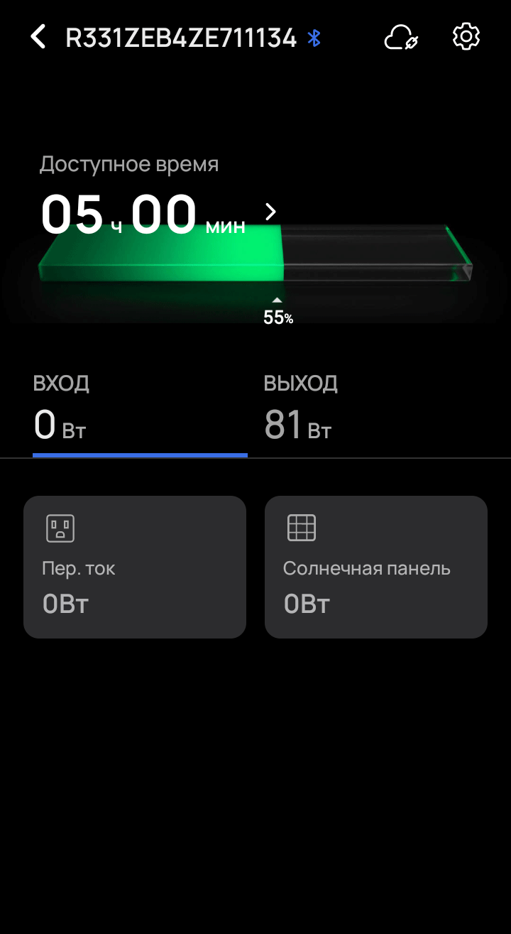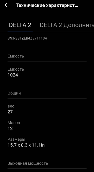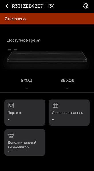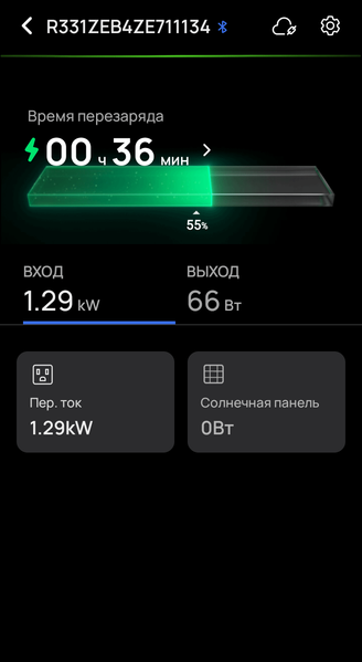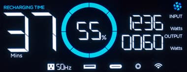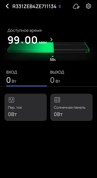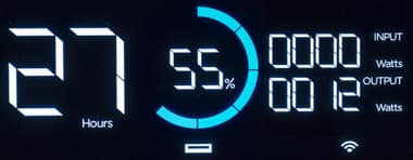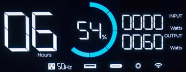Внизу еще строчка со значками, отображающими те или иные режимы: подключение дополнительной батареи, задействование выходов — переменного тока (с указанием частоты в герцах), USB-A и USB-C, 12-вольтового DC. Два правых значка отображают наличие подключения Wi-Fi и состояния заряда (так говорит инструкция, но непонятно, что именно подразумевается: во время заряда символ не появляется).