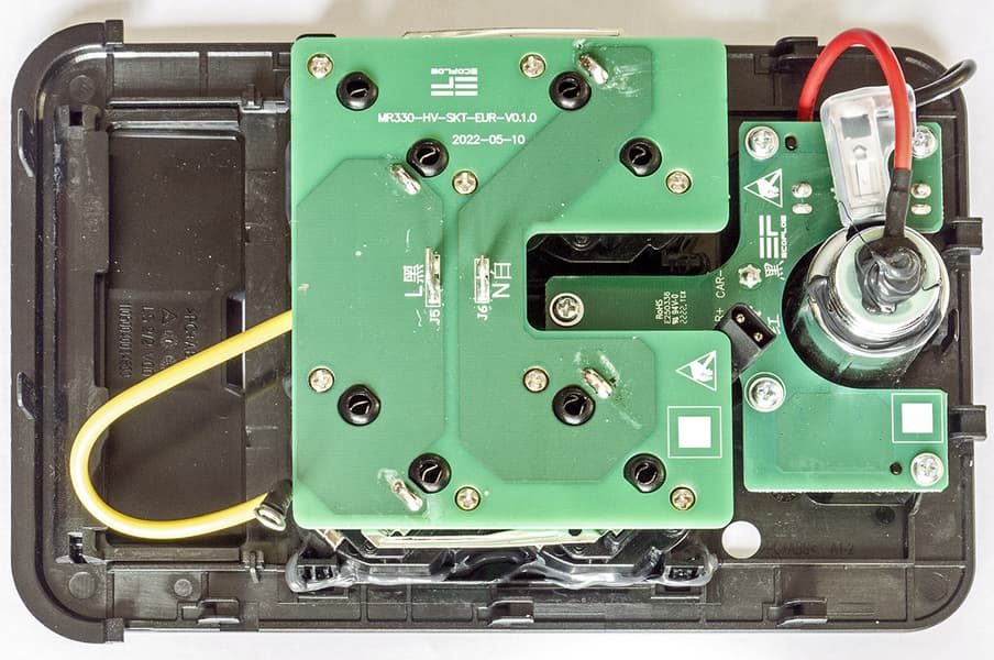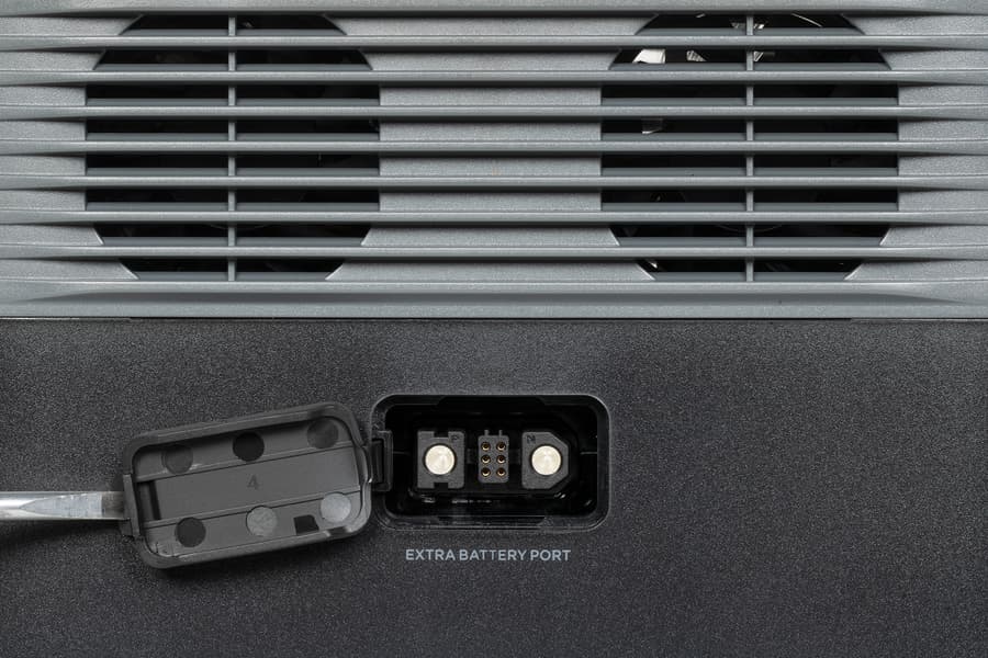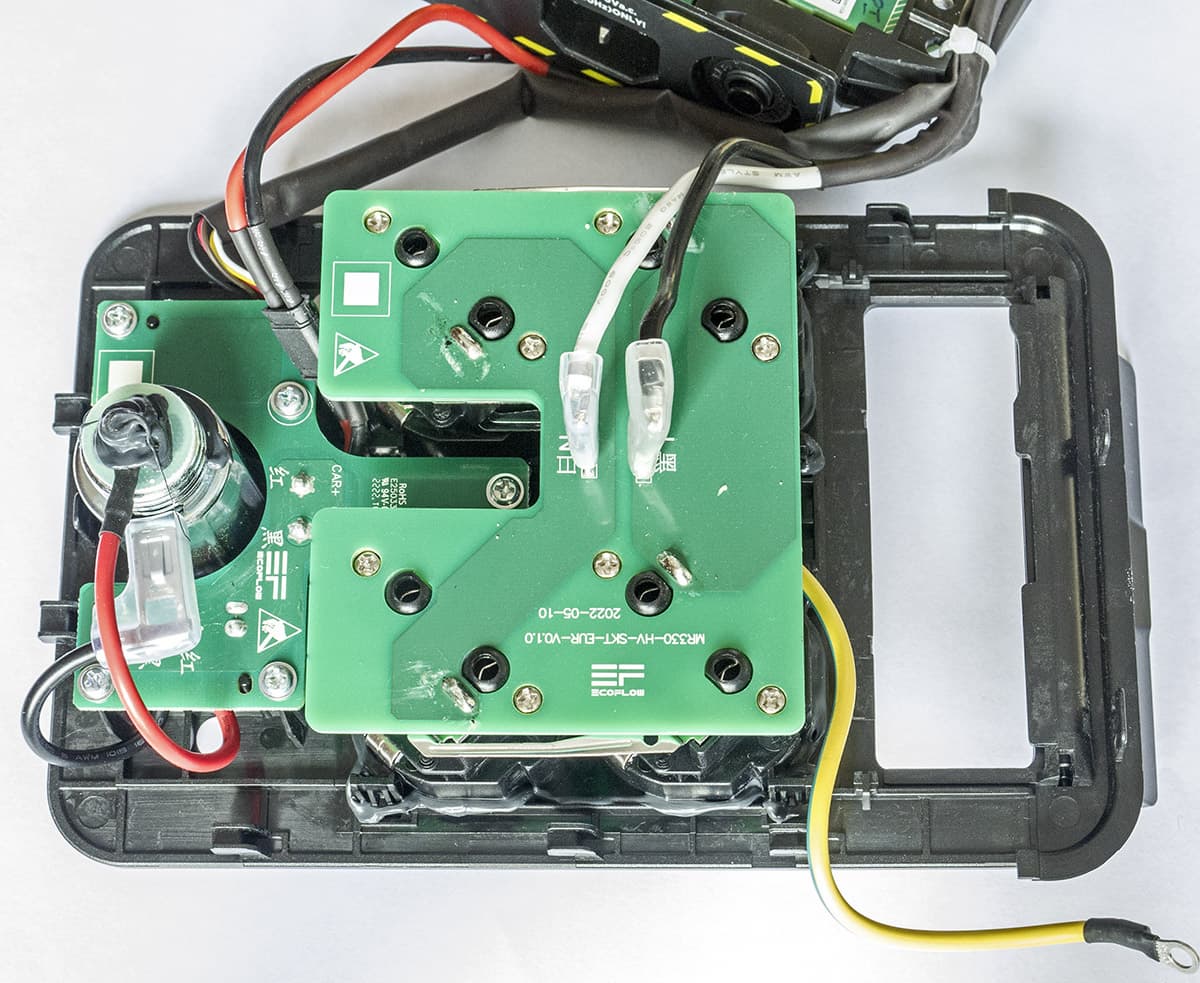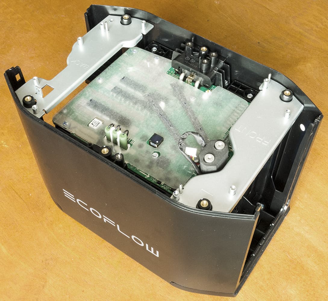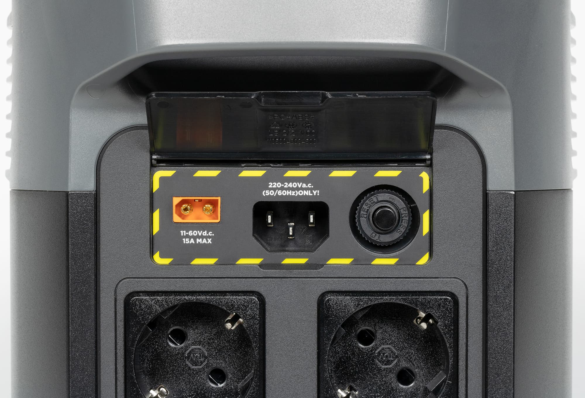 В верхней части имеется крышечка, под ней входы — гнездо С14 под кабель к сети 220—240 В, двухконтактная розетка XT60 для подключения к солнечной панели или бортсети автомобиля, а также шток автоматического многоразового предохранителя. Если эта крышечка открыта, то есть вероятность задеть ее пальцами при попытке взяться за находящуюся чуть выше ручку для переноски и сломать.