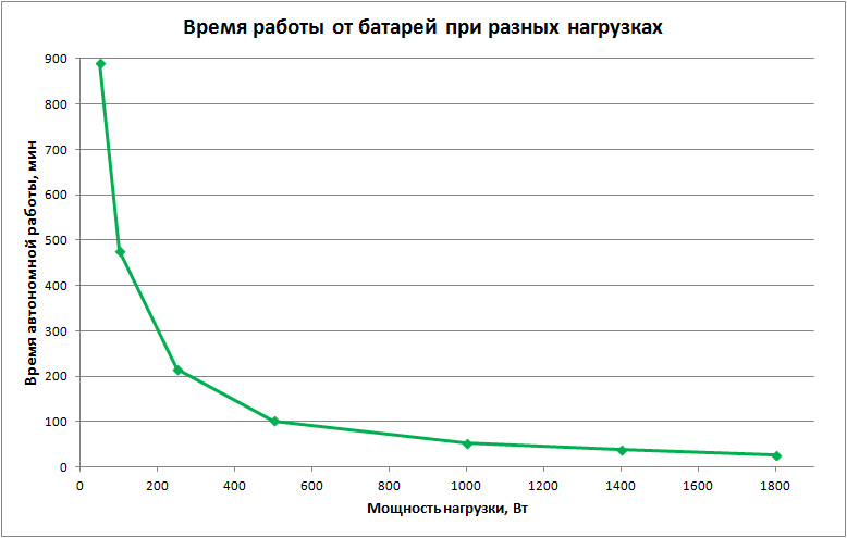 Мы измерили время автономной работы в диапазоне нагрузок (активных — без реактивных составляющих, задавались с точностью ±5%, режим X-Boost включен), результаты сначала представляем в виде графика: