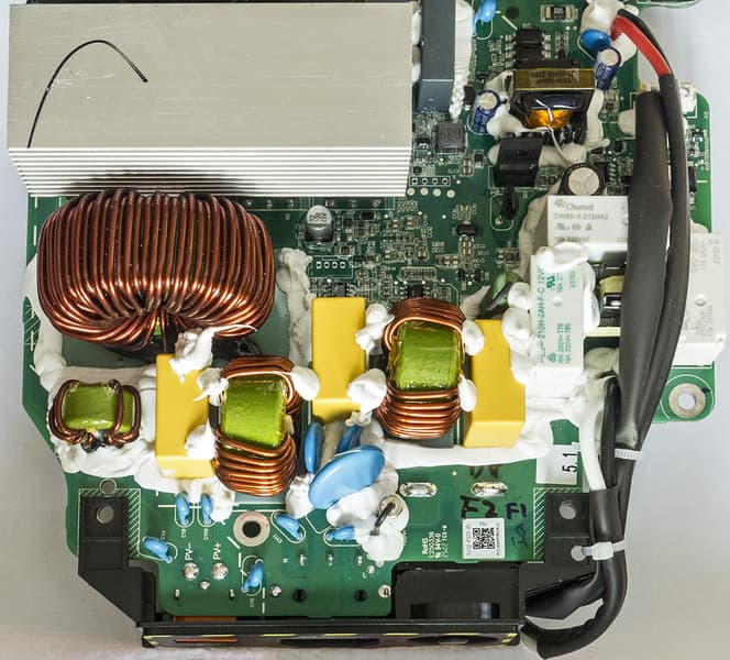 В цепях переменного тока есть полноценные LC-фильтры с конденсаторами Х2 (2,2 мкФ / 275 В), а также варисторы — правда, без связанных с ними термопредохранителей, но есть распаянный керамический предохранитель (номинал рассмотреть не удалось).