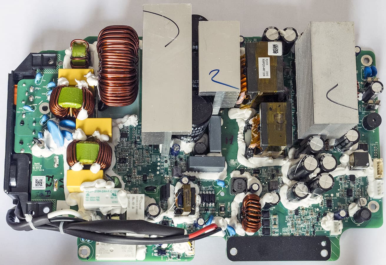 Сколько-нибудь возвышающиеся компоненты платы от души намазаны белым фиксирующим компаундом. С одной стороны, это хорошо — меньше будет влияние вибраций, а с другой создается впечатление неопрятности. Но ведь не каждый владелец и уж точно не каждый день будет любоваться на «потроха» электростанции, а раз-другой можно и потерпеть, тем более, что монтаж в целом очень аккуратный.
