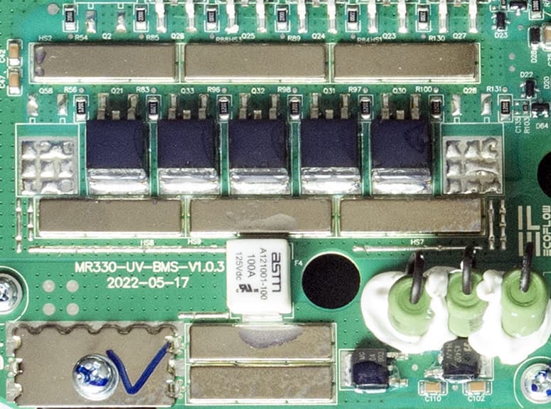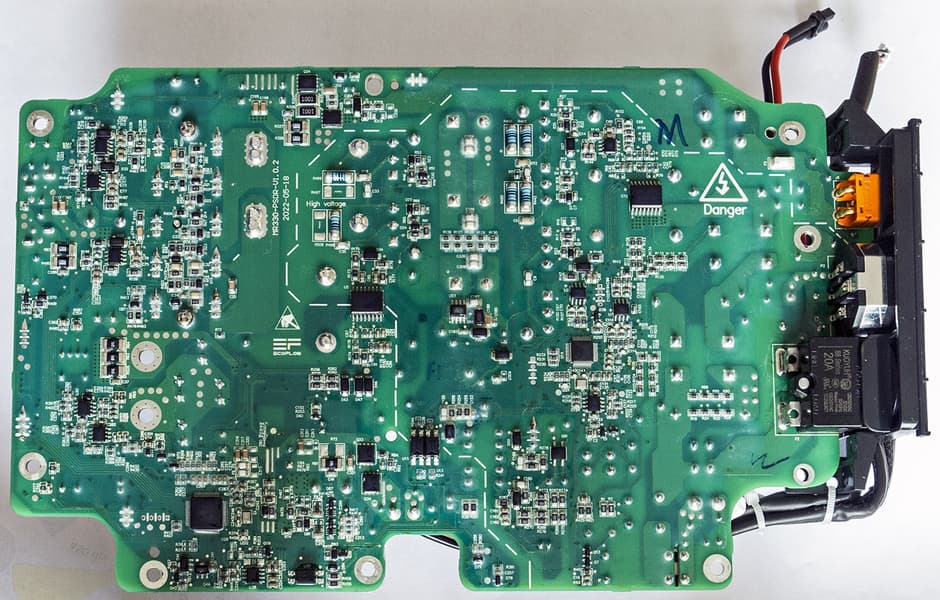 На плате хорошо виден набор мощных ключей и резисторов, похожих на небольшие металлические полоски. Еще две полоски большего размера, проходящие наискосок и покрытые черным изоляционным слоем, это токонесущие шины, идущие к выходным контактам — двум резьбовым втулкам на черном выступе: потребляемый от батареи ток при близких к максимальной нагрузках очень велик (десятки ампер), проводники и разъемы требуются соответствующие. И для защиты используется плавкий предохранитель на 100 А.