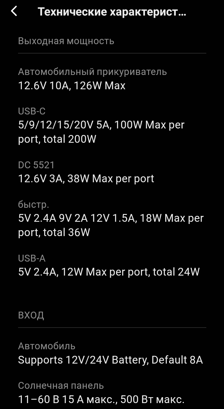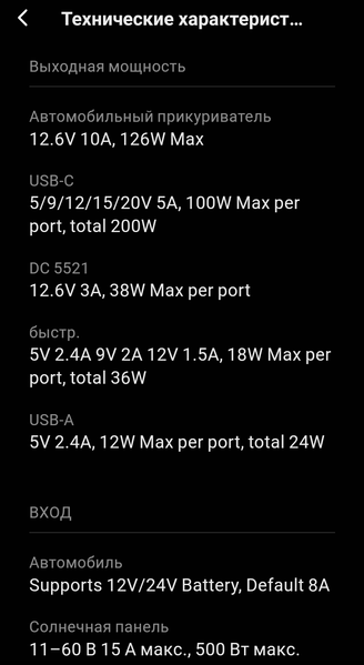 | Выход DC (разъемы 5521 и прикуривателя) | 12,6 В, до 126 Вт в сумме (2 × 5521 — до 3 А на каждый) |