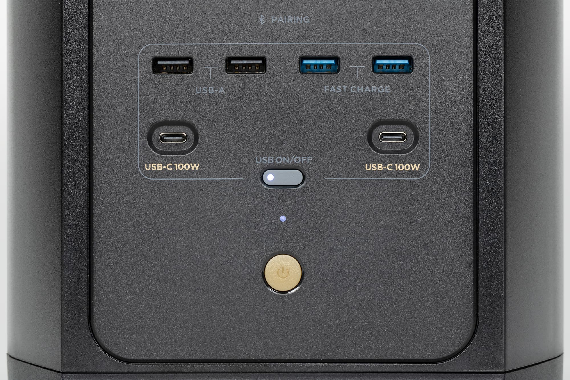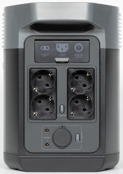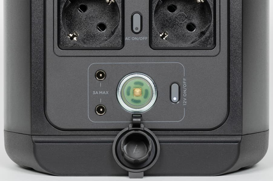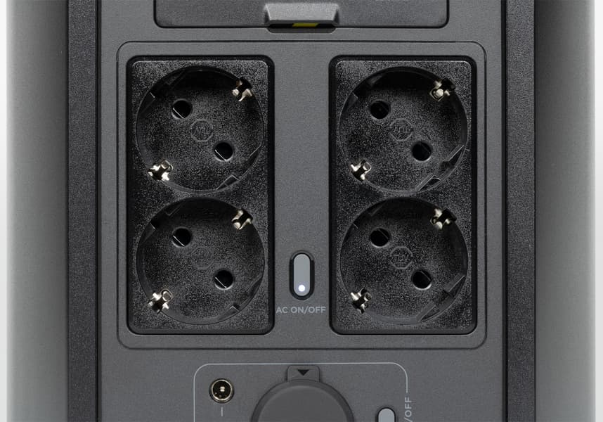 Противоположную стенку занимают две группы выходов, одна содержит четыре розетки Schuko с защитными шторками для подключения устройств с питанием от 230 В переменного тока (для регионов с другими стандартами предусмотрены соответствующие варианты), вторая 12-вольтовая DC — закрытое резиновой пробкой гнездо прикуривателя (инструкция называет его автомобильным зарядным устройством) и два штырьковых выхода DC5521. Каждая группа подключается-отключается собственной кнопкой со встроенным индикатором.