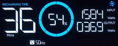 После отключения по исчерпанию энергии мы подключили внешнюю сеть AC, однако заряд не начался — вместо этого отобразился символ перегрева батареи. Для нормализации температуры пришлось ждать более 2 часов (масса батареи немалая, остывает долго), все это время аппарат был подключен к розетке, регулярно на 5-7 секунд он отключал экран и запускал вентиляторы на малой скорости, а потом возвращался к индикации ошибки. В конце концов заряд начался и через час с четвертью благополучно завершился.