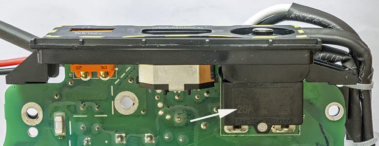 Сложно сказать, при чем тут X-Stream: скорее это похоже на работу автоматического предохранителя, шток которого находится сзади вверху под крышечкой. Как показано на фото, его номинал как раз те самые 20 А, причем в конструкции подобных предохранителей используется терморасцепитель, то есть станция в течение немалого времени может потреблять и существенно бо́льшие токи, а ведь вилки-розетки Schuko рассчитаны максимум на 16 А, да и для штатного входного кабеля 3×1,0 мм² токи в 20 ампер однозначно велики.