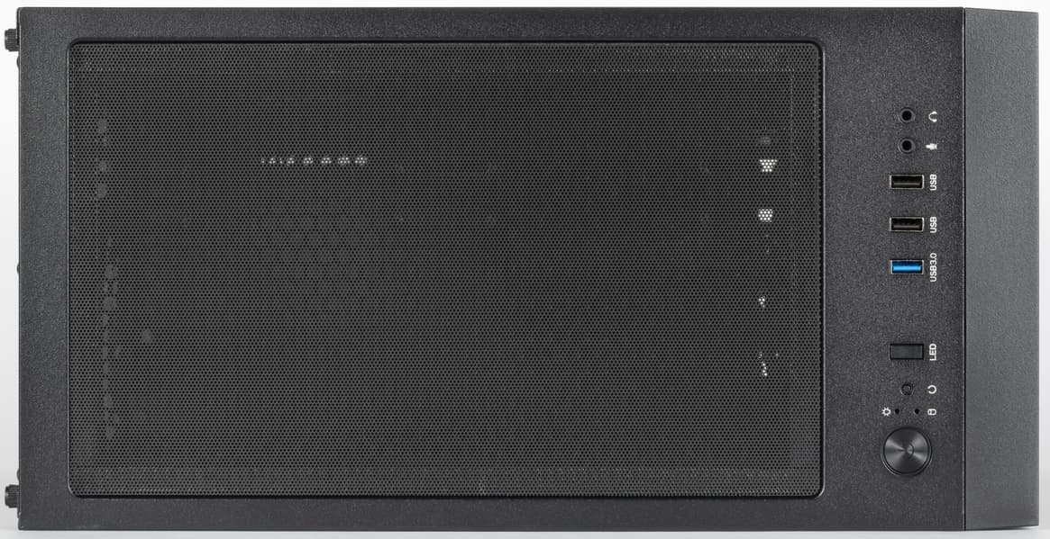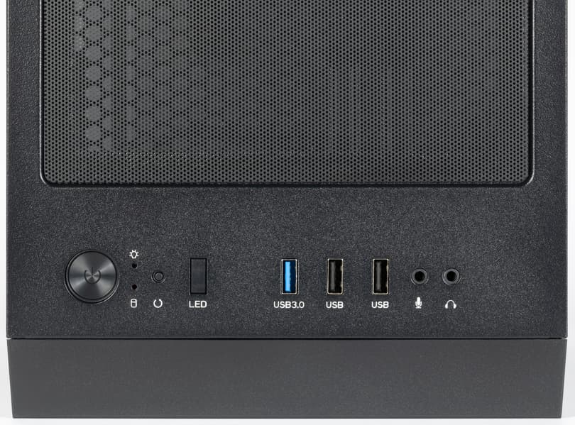 Интерфейсные разъемы и кнопки расположены на верхней плоскости шасси возле лицевой панели. Имеются два порта USB 2.0 и один USB 3 (все они Type-A, а в современном компьютере хотелось бы иметь и хоть один Type-C с удобным доступом), отдельные разъемы для подключения микрофона и наушников, два индикатора — включения и дисковой активности, крошечная кнопка перезагрузки, кнопка побольше для управления подсветкой и самая большая для включения-выключения ПК. Усилие нажатия кнопок комфортное, свободный ход совсем небольшой, для Power нельзя исключить срабатывания от случайного прикосновения, а для Reset из-за ее размера подобное вряд ли возможно: нажимать придется подручным инструментом с острым кончиком.