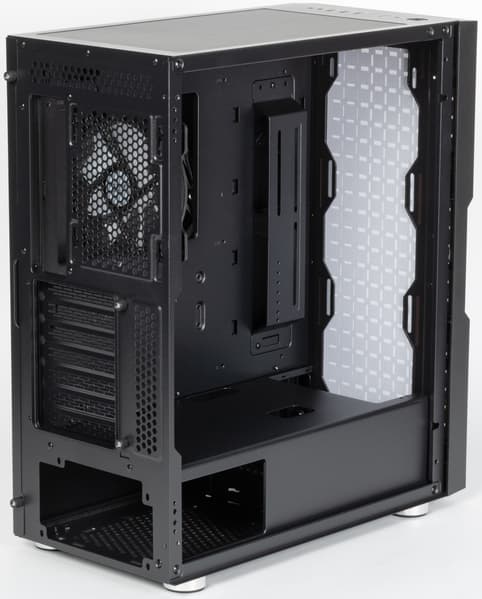 Предустановлен единственный 120-миллиметровый вентилятор с RGB-подсветкой, он находится сзади и работает как вытяжной. Как сказано чуть выше, он 4-контактным разъемом подключен к встроенному контроллеру подсветки корпуса, скорость вращения не регулируется. Заменить его на 140-миллиметровый не позволят имеющиеся крепежные отверстия.