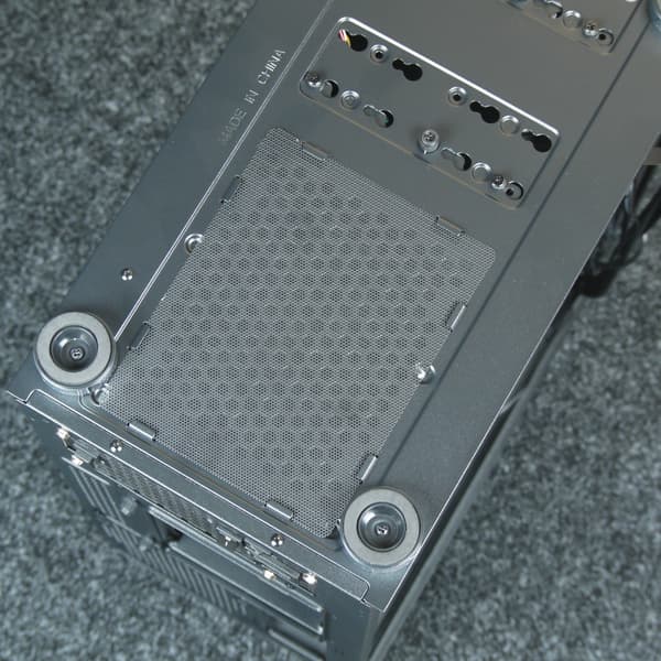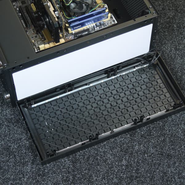 Подобный фильтр имеется и на днище в месте установки блока питания, но он значительно меньше по размеру и удерживается не магнитами, а штампованными Г-образными выступами со всех четырех сторон. Для его извлечения и установки на место при обслуживании корпус придется класть на бок или сильно наклонять.
