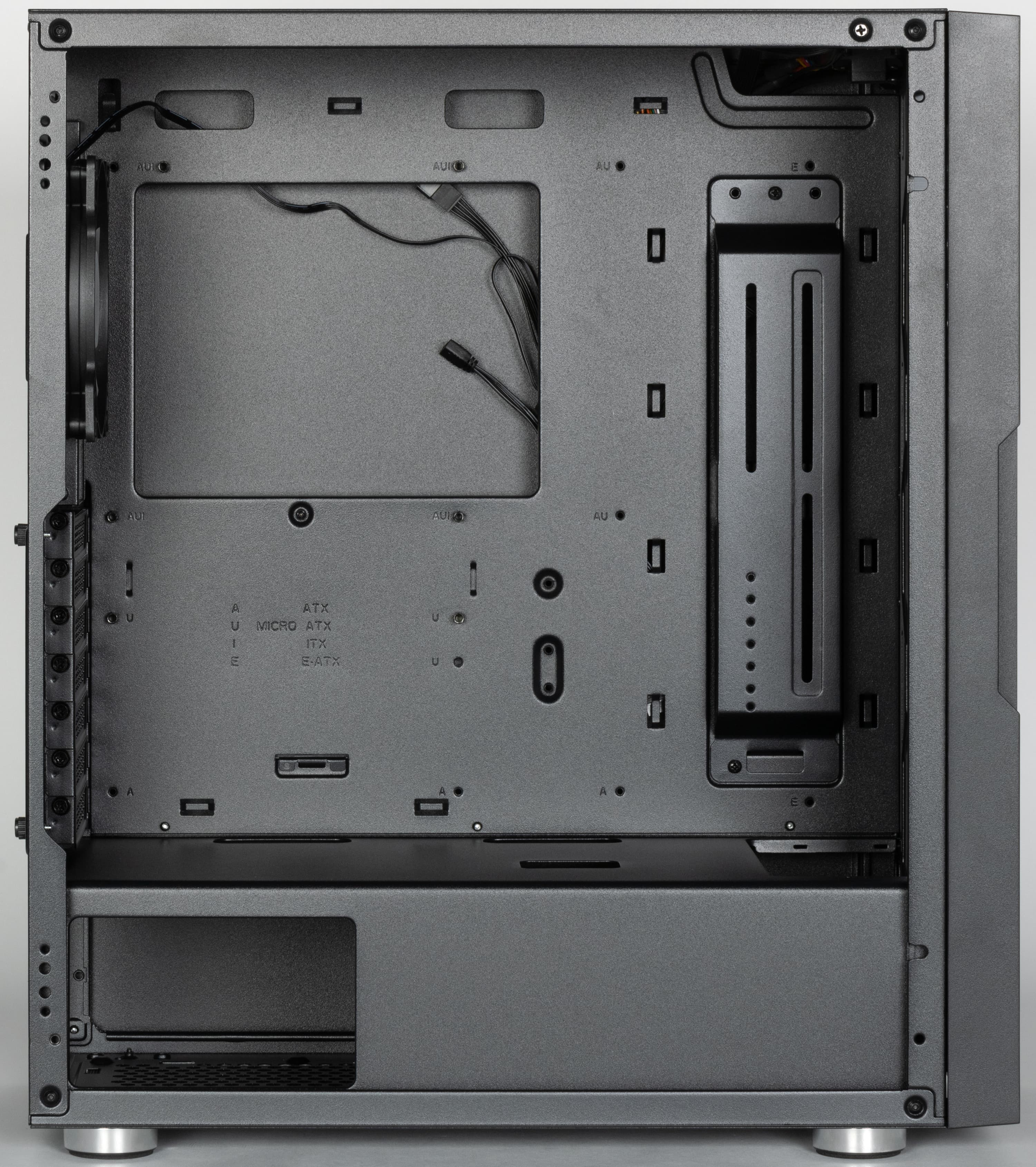 По высоте корпус разбит на два объема, которые разделяются перегородкой с отверстиями для кабелей. В верхнем вертикально размещается системная плата форматом до E-ATX включительно с платами расширения, в нижнем горизонтально устанавливается блок питания и имеется корзина для 3,5-дюймовых накопителей. А для установки 2,5-дюймовых HDD/SSD есть места на оборотной стороне основания для системной платы.