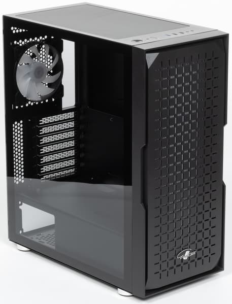 Корпус башенного типа с нижним расположением блока питания, размеры по нашему замеру: высота 478 мм, ширина 210 мм, глубина 420 мм (с учетом выступающих элементов). Как сейчас принято, правая боковая стенка металлическая, а левая целиком сделана из тонированного стекла.