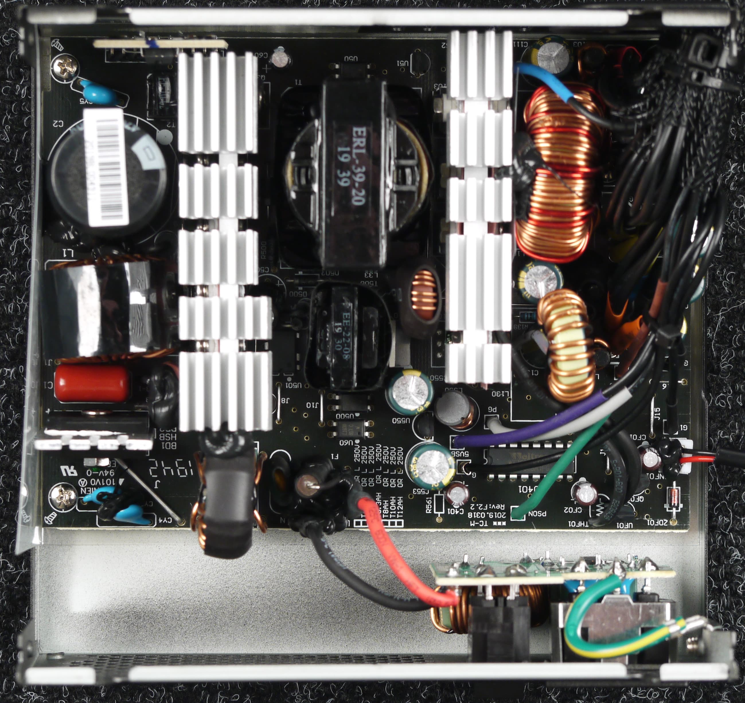Платформа тут явно не самая передовая: реализована групповая стабилизация каналов +5VDC и +12VDC, а также +3.3VDC на отдельном стабилизаторе на базе магнитного усилителя. Все вполне типично для решений бюджетного сегмента.