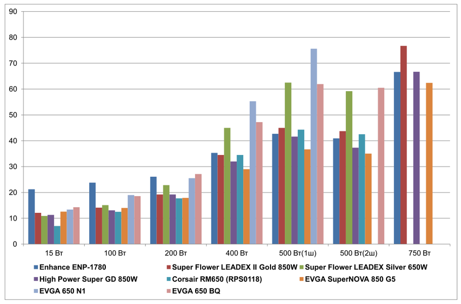 | EVGA 650 BQ | 14,3 | 18,6 | 27,1 | 47,2 | 61,9 | 60,5 |