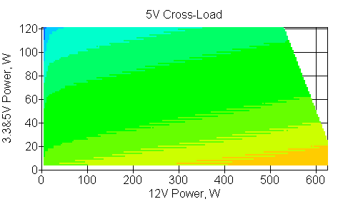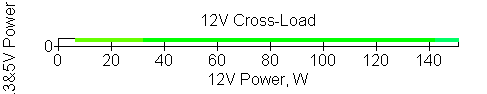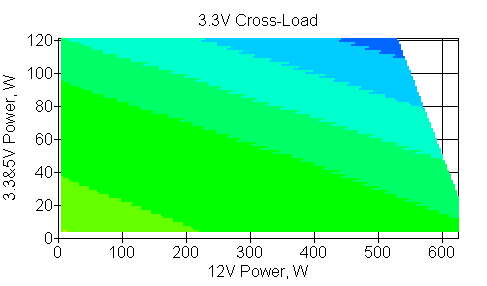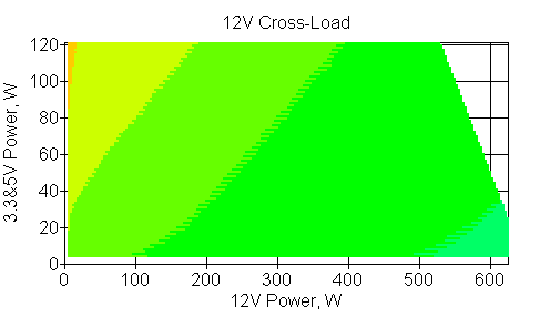 Следующим этапом инструментального тестирования является построение кросснагрузочной характеристики (КНХ) и представление ее на четвертьплоскости, ограниченной максимальной мощностью по шине 3,3&5 В с одной стороны (по оси ординат) и максимальной мощностью по шине 12 В с другой (по оси абсцисс). В каждой точке измеренное значение напряжения обозначается цветовым маркером в зависимости от отклонения от номинального значения.