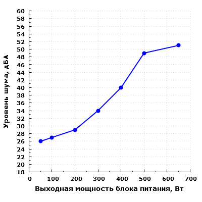 При дальнейшем увеличении выходной мощности уровень шума заметно повышается. При нагрузке в 400 Вт шум блока питания уже превышает значение в 40 дБА при условии настольного размещения, то есть при расположении блока питания в ближнем поле по отношению к пользователю. Подобный уровень шума можно охарактеризовать как достаточно высокий.