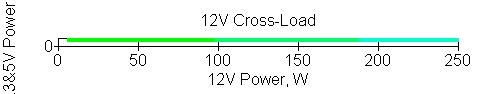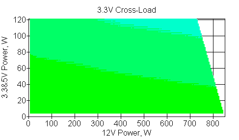 Следующим этапом инструментального тестирования является построение кросснагрузочной характеристики (КНХ) и представление ее на четвертьплоскости, ограниченной максимальной мощностью по шине 3,3&5 В с одной стороны (по оси ординат) и максимальной мощностью по шине 12 В с другой (по оси абсцисс). В каждой точке измеренное значение напряжения обозначается цветовым маркером в зависимости от отклонения от номинального значения.