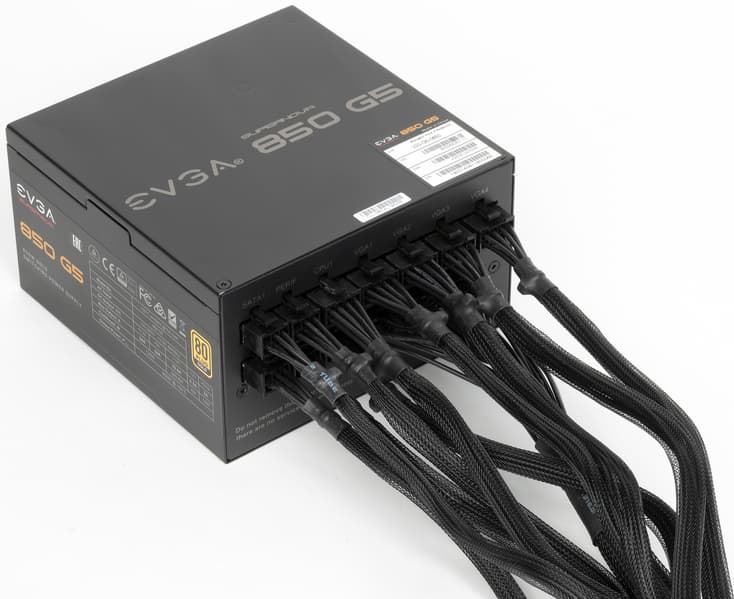 Серия Supernova G5 представляет собой золотую середину в ассортименте блоков питания компании EVGA. Снизу ее подпирают бюджетные решения, а выше идут модели стоимостью заметно за 200 долларов, даже в рознице в США. БП Supernova G5 имеют стандартный для подобной стоимости джентльменский набор: все конденсаторы японских производителей, вентилятор на гидродинамическом подшипнике, гибридный режим работы системы охлаждения, а также полностью съемные провода и сертификат 80Plus Gold. А также гарантия производителя 10 лет. В серии представлены модели мощностью 650, 750, 850 и 1000 Вт.