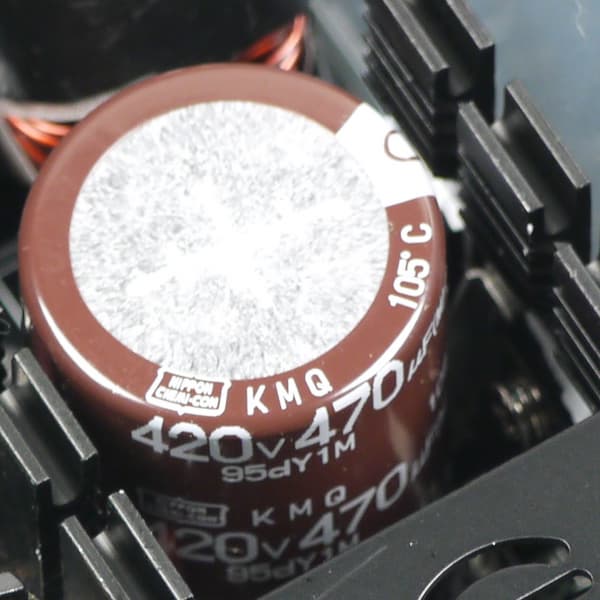 Все конденсаторы в блоке питания имеют японское происхождение, насколько об этом можно судить по маркировке. В основной массе это продукция под торговыми марками Nippon Chemi-Con и Rubycon. Установлено большое количество полимерных конденсаторов.