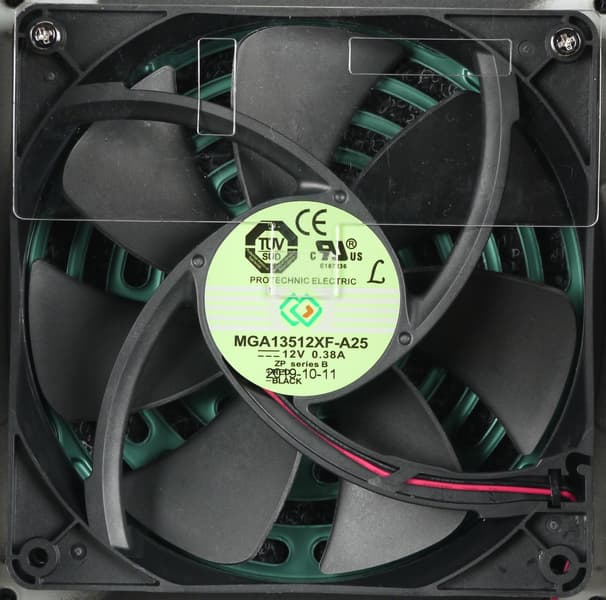 В блоке питания установлен вентилятор MGA13512XF-A25 типоразмера 135 мм производства Protechnic Electric. Вентилятор, согласно данным производителя, основан на гидродинамическом подшипнике и имеет скорость вращения 2300 оборотов в минуту. Подключение двухпроводное через разъем. Вентилятор вполне прозрачно намекает на то, кто является производителем платформы, на которой базируется данный БП. Это хорошо известная в России компания с названием из трех букв.