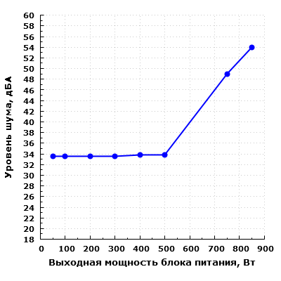 При дальнейшем увеличении выходной мощности уровень шума заметно повышается. При нагрузке в 750 Вт шум блока питания приближается к 50 дБА, это очень громко. На максимальной мощности уровень шума составил около 54 дБА.