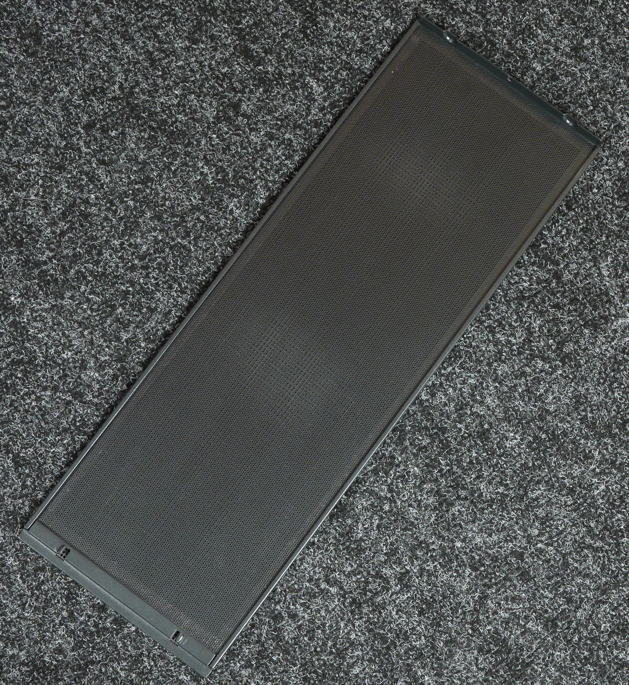 Спереди их вообще два: крупноячеистый фильтр из проштампованного листа пластика установлен на съемной рамке на лицевой стороне передней панели, а мелкоячеистый синтетический фильтр установлен на передней стенке шасси под передней панелью. Последний фиксируется при помощи зацепов снизу и двух магнитов сверху, его можно помыть целиком, но для его извлечения нужно снимать переднюю панель.