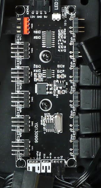 Контроллер вентиляторов в корпусе действительно многофункциональный: помимо управления подсветкой, он умеет управлять еще и скоростью вращения четырех вентиляторов с ШИМ (с четырехконтактными разъемами).