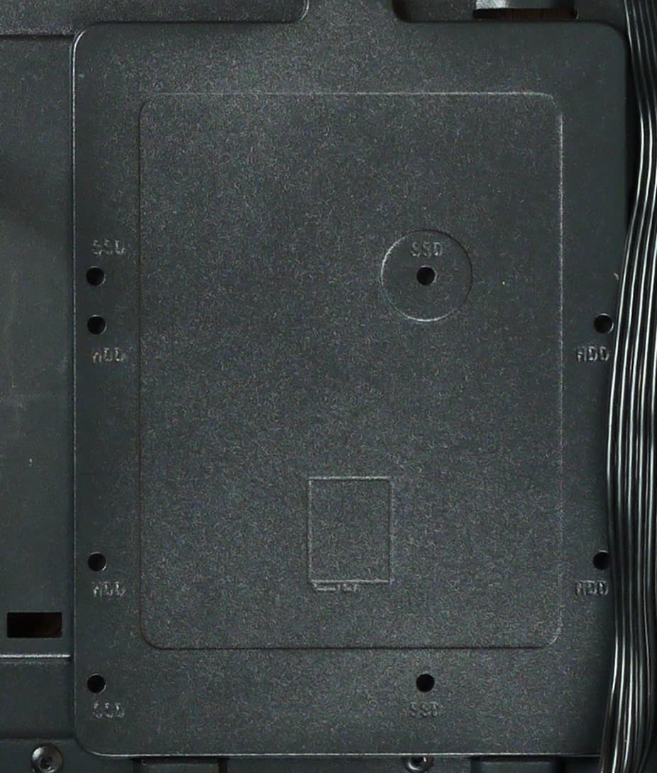 На оборотной стороне основания для системной платы присутствуют места для установки накопителей. А вот посадочные места для накопителей с внешним доступом в корпусе полностью отсутствуют.