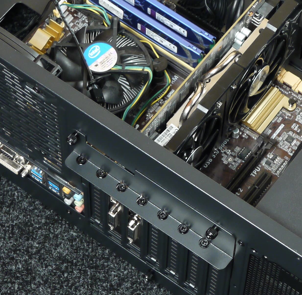 Система фиксации карт расширения предусматривает крепление на винтах снаружи корпуса с индивидуальной фиксацией, а также дополнительной общей прижимной рамкой, что увеличивает объем работы, который нужно выполнить при монтаже или демонтаже платы расширения. Все заглушки для плат расширения многоразовые и фиксируются винтами.