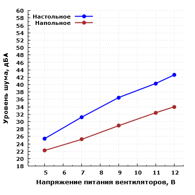 При большем удалении корпуса от пользователя и размещении его, к примеру, на полу под столом шум можно будет охарактеризовать как минимально заметный при питании вентиляторов от 5 В, а при питании от 12 В — как средний для жилого помещения в дневное время суток.