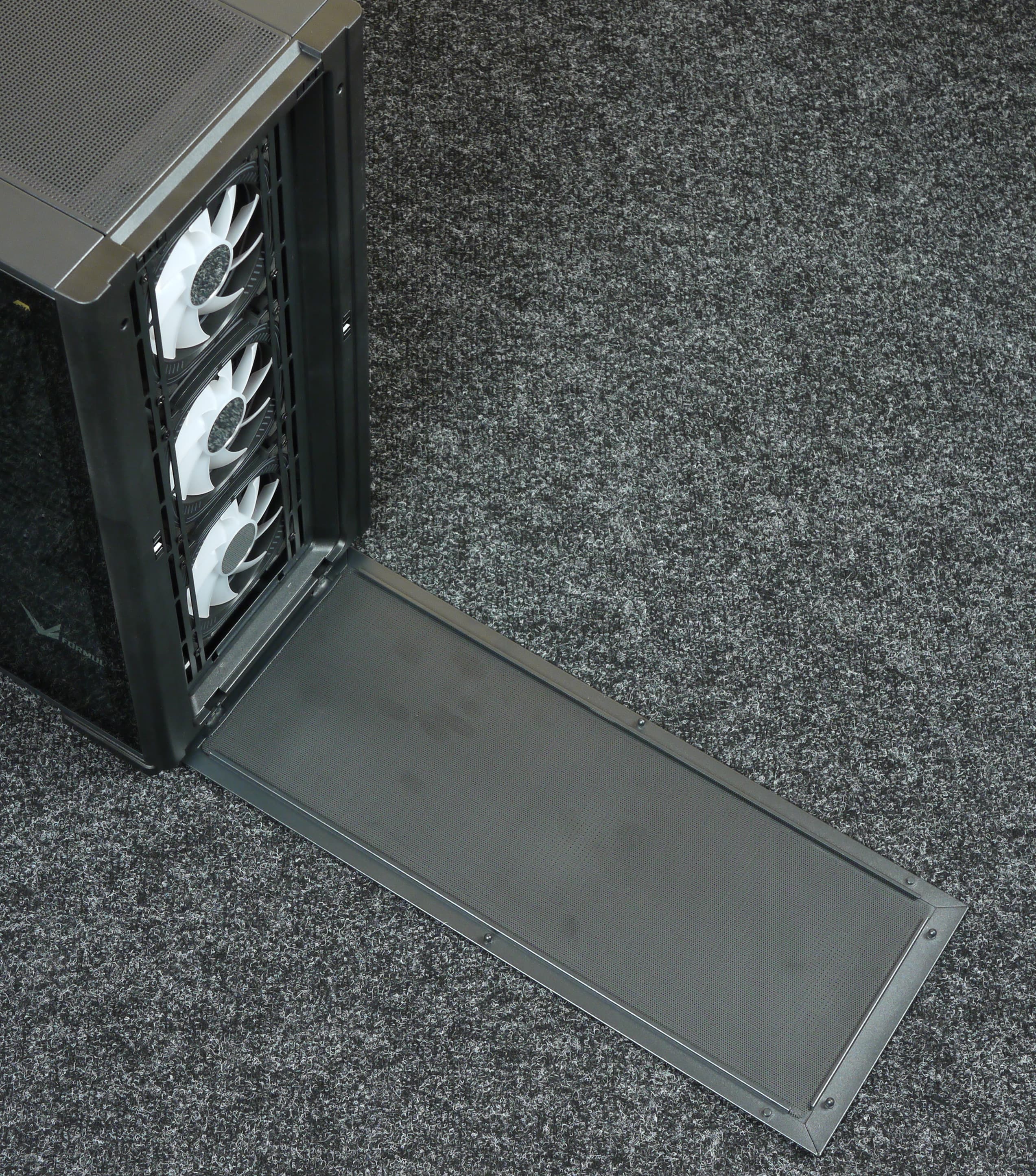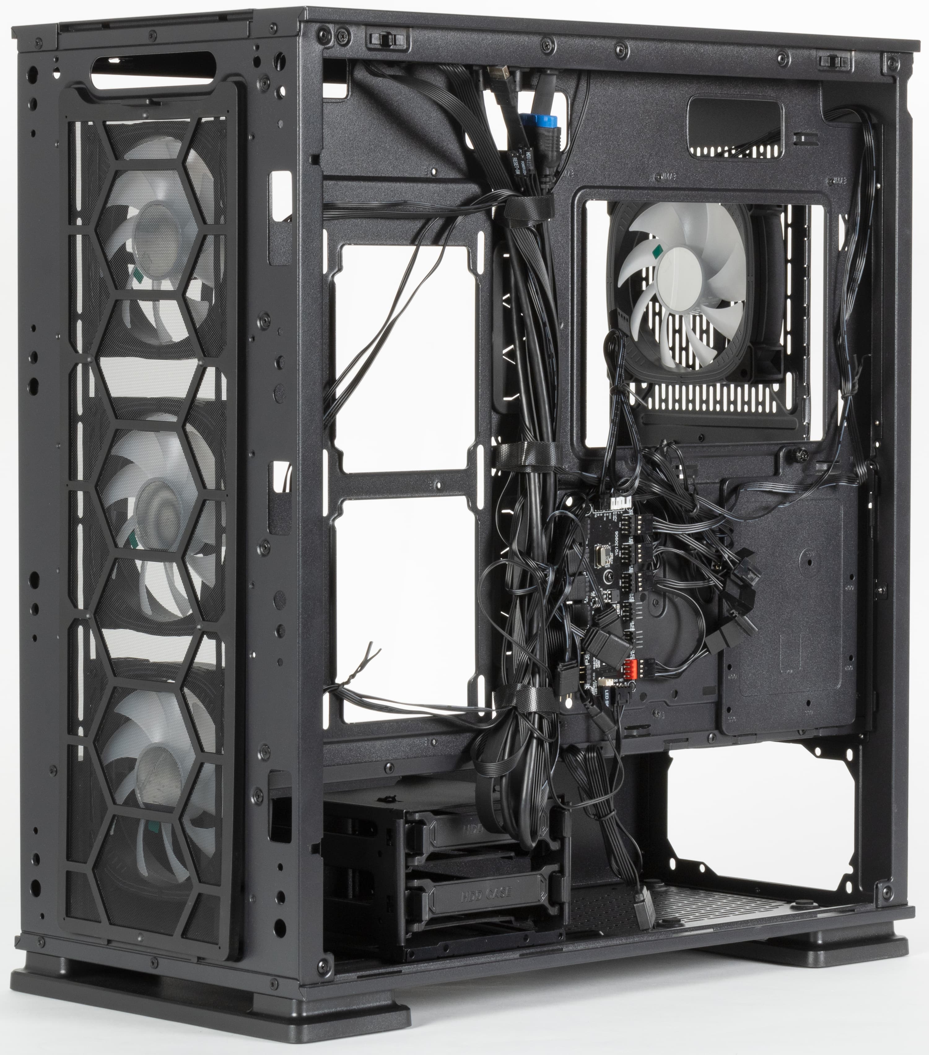 В корпусе предусмотрена возможность установки большого количества вентиляторов типоразмера 120 или 140 мм. Посадочные места для них имеются спереди, сверху, сзади, а также с правой стороны. Штатно предустановлены 4 вентилятора типоразмера 120 мм: один — сзади, остальные три — спереди. Вентиляторы имеют по два разъема: стандартный четырехконтактный разъем с возможностью подключения к системной плате с ШИМ-управлением и стандартный трехконтактный c колодкой 1×4 (ARGB) для управления подсветкой.