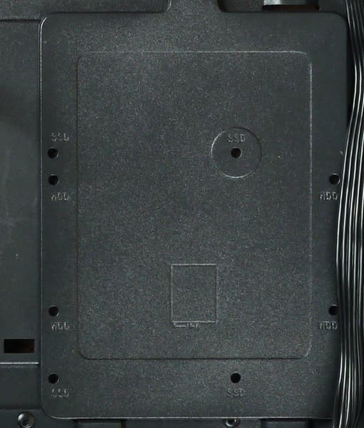 Еще одно посадочное место для накопителей 2,5/3,5 дюйма имеется на монтажной пластине, установленной на обратной стороне основания для системной платы ближе к задней панели. Крепление пластины выполнено при помощи зацепов и винта с накатной головкой. Диск фиксируется при помощи винтов, закручиваемых со стороны дна накопителя.