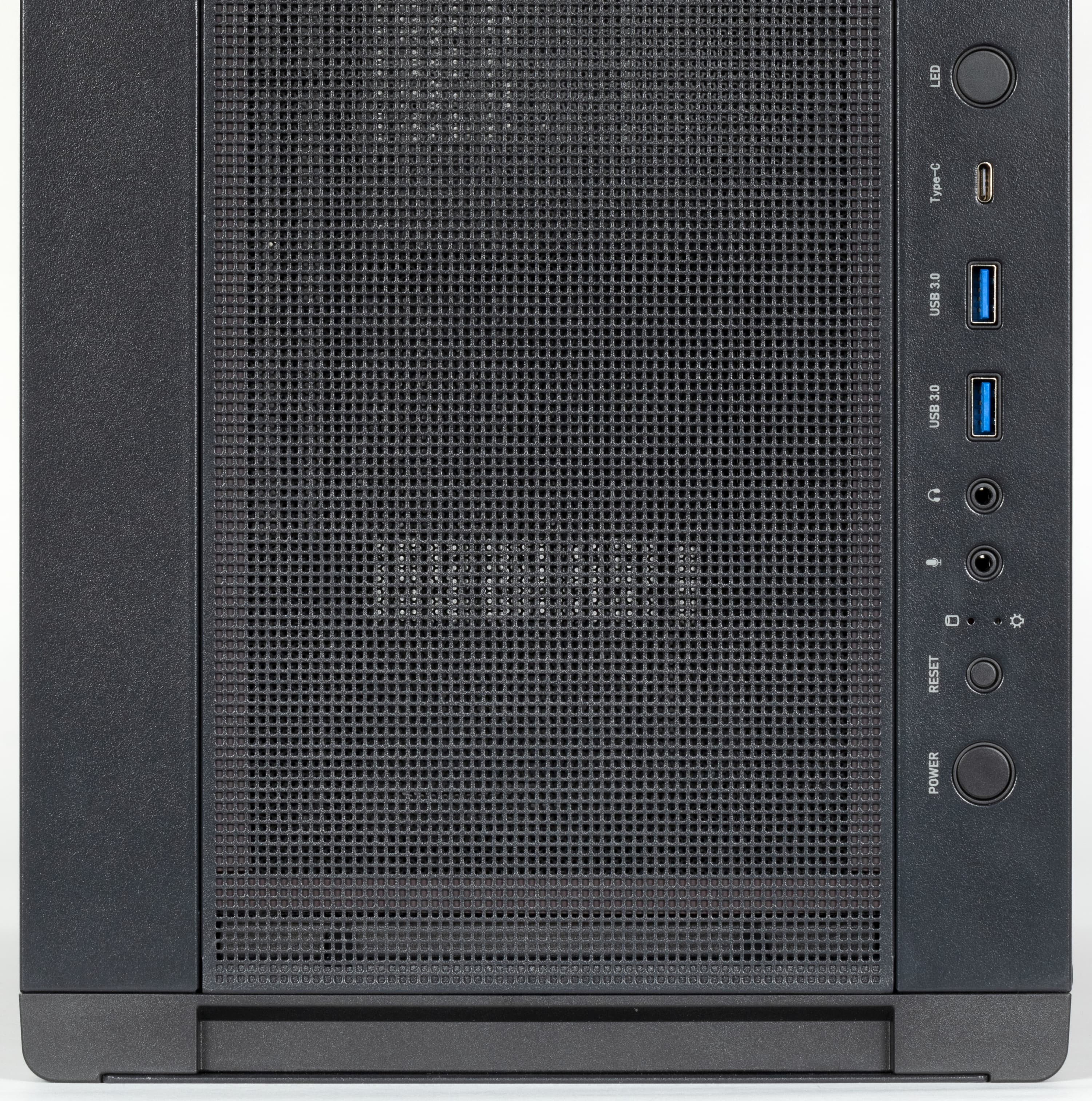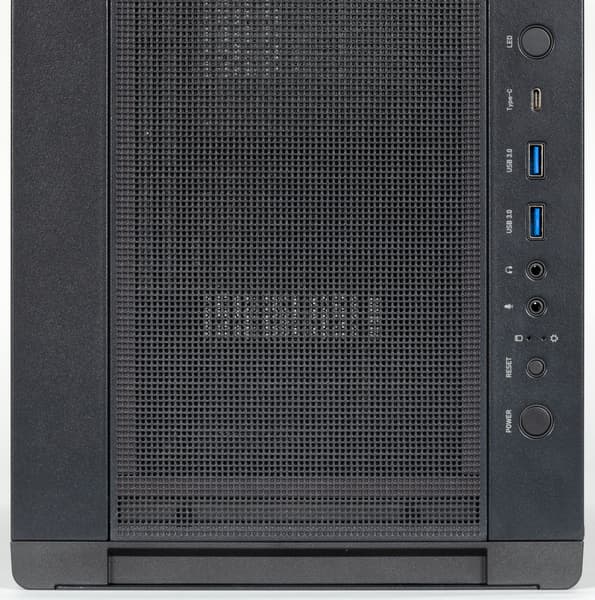 Интерфейсные разъемы и кнопки расположены на верхней панели вдоль правой стенки корпуса. Здесь есть два порта USB3 Gen1 (USB 3.0), один порт USB3 Gen2 (USB 3.1) Type-C, отдельные разъемы для подключения микрофона и наушников, кнопка включения, кнопка управления подсветкой и кнопка перезагрузки (у бюджетных моделей обычно две кнопки, подсветкой и перезагрузкой управляет одна).