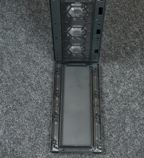 Стальная стенка аналогична стеклянной по системе крепления, но жесткость ее отличается в худшую сторону, в первую очередь из-за огромных вентиляционных отверстий. В целом обе стенки достаточно удобно снимать и устанавливать обратно.