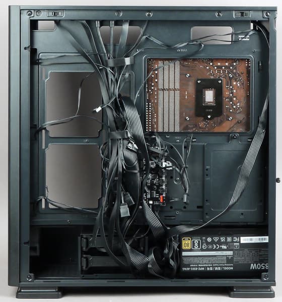Порядок сборки ПК в данном корпусе особого значения не имеет, так как компоненты разнесены и не мешают друг другу, но лучше начать с установки блока питания и прокладки проводов.