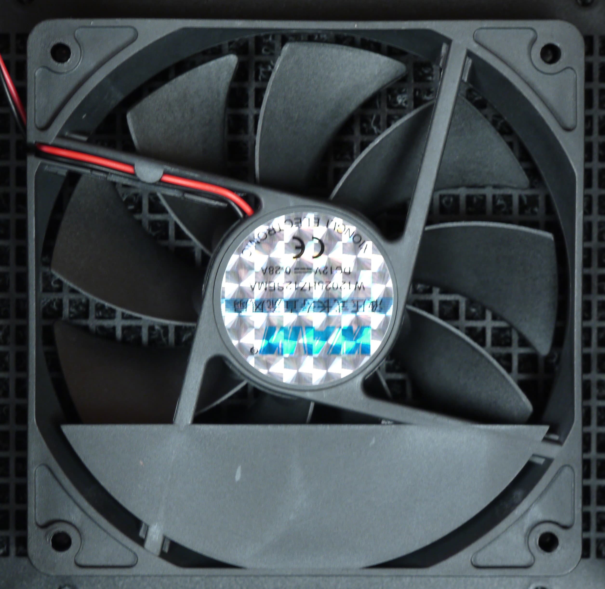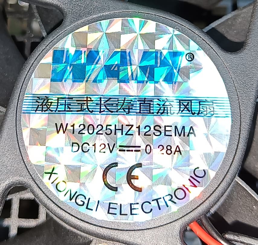 В блоке питания установлен вентилятор Xiongli Electronic W12025HZ12SEMA типоразмера 120 мм. Производителем БП заявлено, что вентилятор выполнен на гидродинамическом подшипнике. Подключение двухпроводное, разъемное, так что поменять вентилятор будет несложно, а гарантийный срок он должен отработать без проблем.