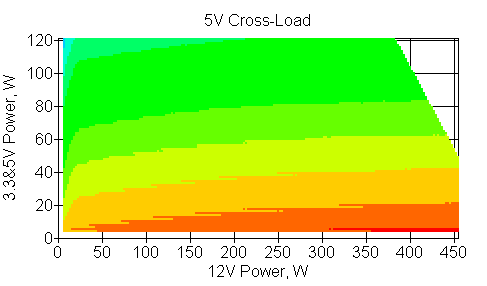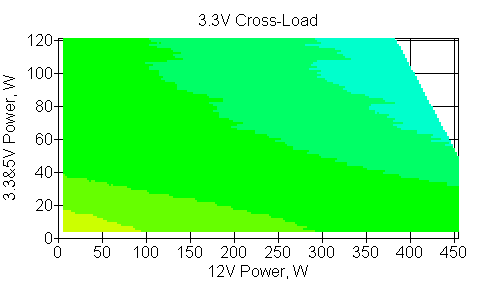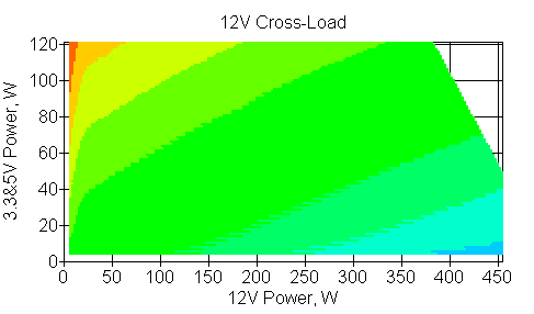 Следующим этапом инструментального тестирования является построение кросснагрузочной характеристики (КНХ) и представление ее на четвертьплоскости, ограниченной максимальной мощностью по шине 3,3&5 В с одной стороны (по оси ординат) и максимальной мощностью по шине 12 В с другой (по оси абсцисс). В каждой точке измеренное значение напряжения обозначается цветовым маркером в зависимости от отклонения от номинального значения.
