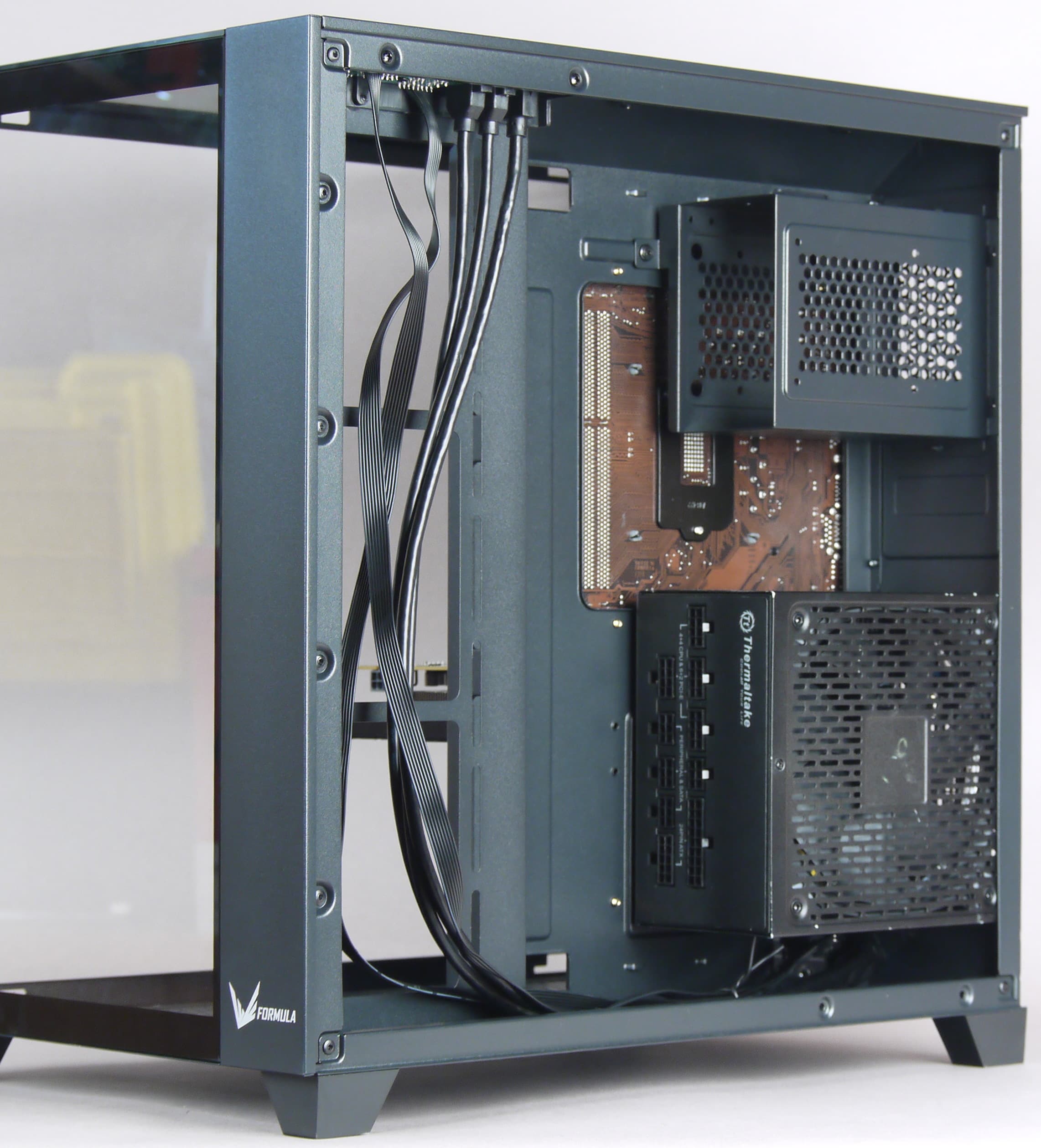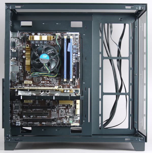 В левой части вертикально размещается системная плата форматом до ATX включительно с платами расширения, в правом вертикально устанавливается блок питания, там же находятся места для установки HDD/SSD.