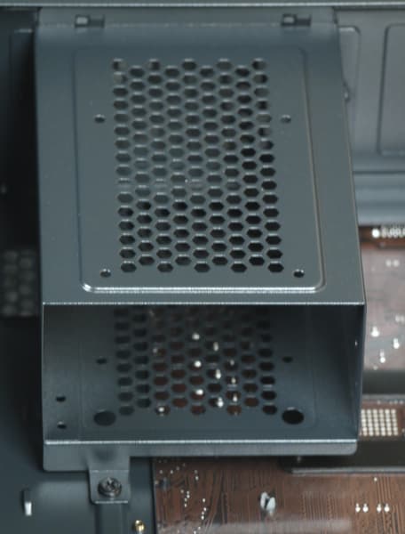 Установленные накопители не попадают в зону действия вентиляторов, но сама корзина играет роль теплоотвода, а на задней стенке в месте ее расположения имеется область с отверстиями.