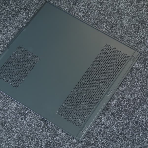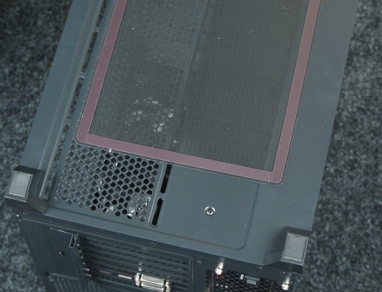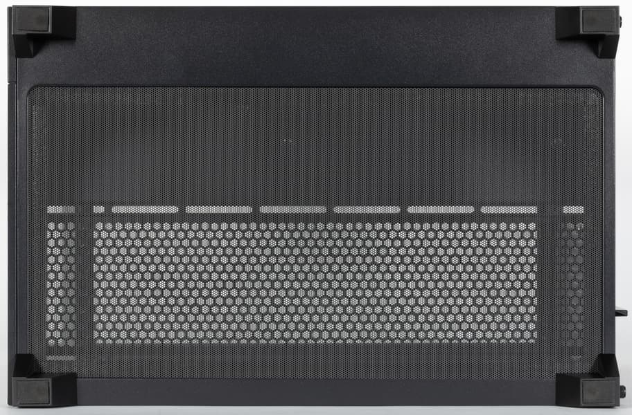 Внизу имеется пластиковая сетка с мелкими отверстиями, которая крепится снаружи с помощью приклеенных по ее периметру магнитных полос и закрывает значительную часть днища. Правда, для обслуживания этого фильтра собранный компьютер придется класть на бок или сильно наклонять — края сетки заходят под ножки, вслепую снять ее сложно, а установить обратно еще труднее.