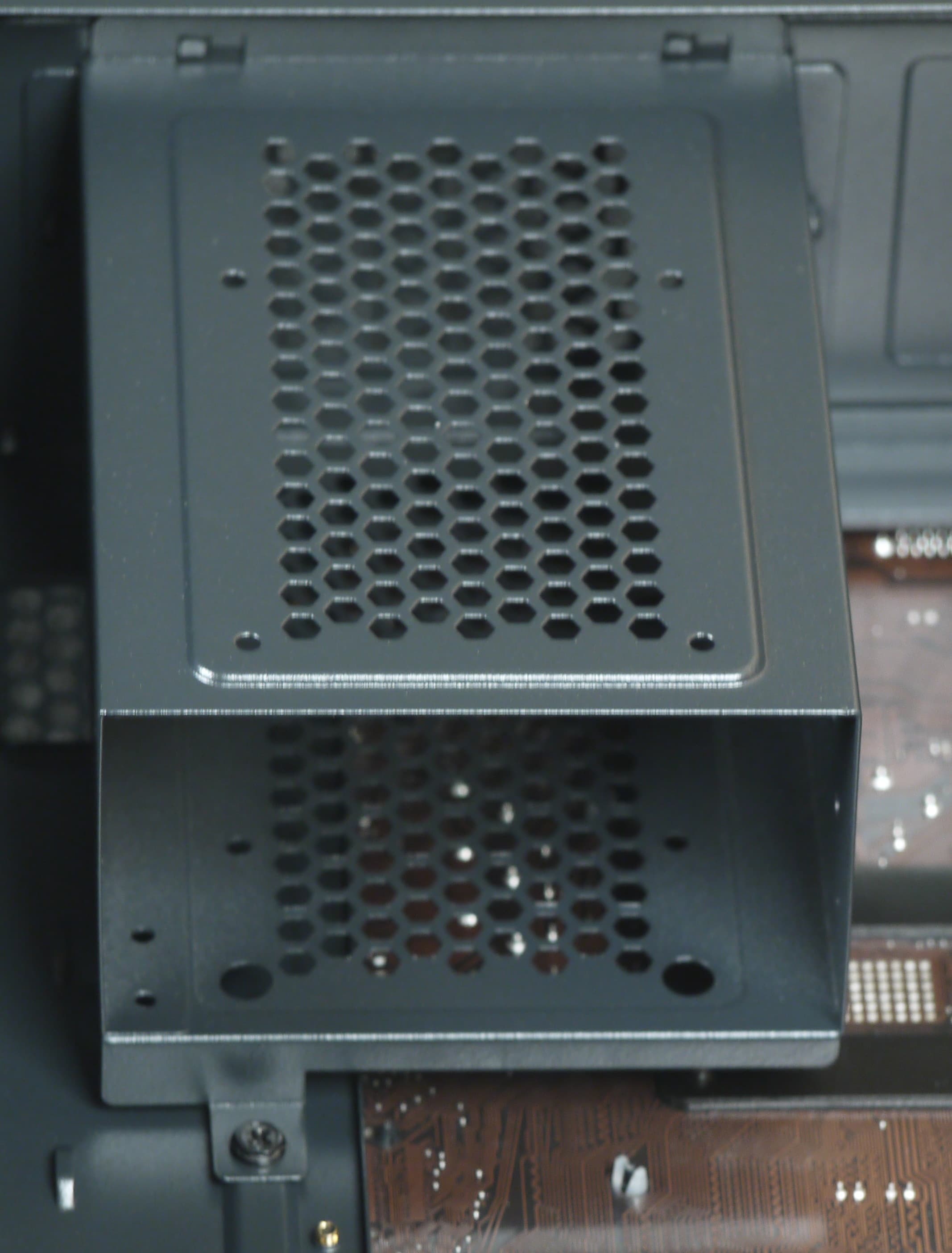 Соответственно в днище корпуса и в передней части металлической правой боковой стенки имеются вентиляционные отверстия. Еще одна область с отверстиями на правой стенке нужна для подачи воздуха к блоку питания.